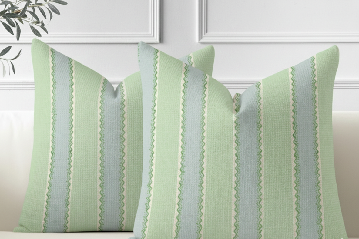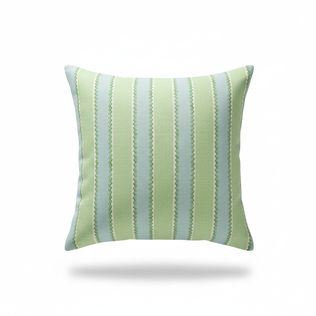 This cushion is a piece of light, sweet, and shabby chic charm that uses contrasting stripes to add height and soft texture to any setting. It is perfect for creating a coastal or country style. It features a pattern of alternating vertical stripes in light pastel colors: a bright mint or pistachio green and a soft grayish blue or sky blue. A distinctive and charming detail is the ruffled or scalloped trim line that runs down the center of the green stripes, adding a visual texture and an artisanal touch.