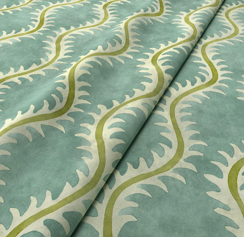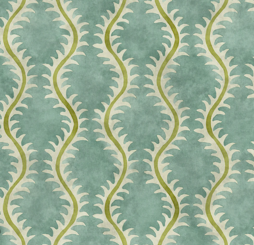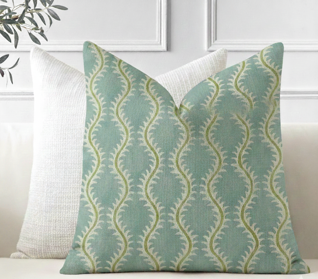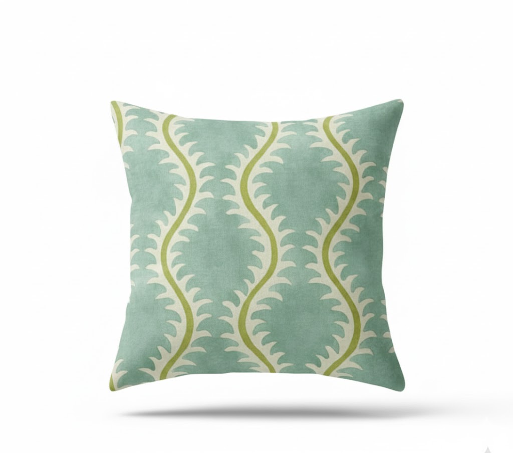 Nuestro Cojín Helter Skelter es una pieza de diseño dinámico, elegante y con un aire retro-orgánico que aporta movimiento y una sofisticación vintage a cualquier espacio. Presenta un patrón de ondas o enredaderas verticales que se mueven de forma rítmica. Estas olas están formadas por dos capas de follaje estilizado: una capa interna en verde lima vibrante y una capa externa festoneada en color blanco roto o crema. Todo este diseño se asienta sobre un fondo sólido de azul agua o verde menta pálido con un sutil efecto aterciopelado o envejecido.