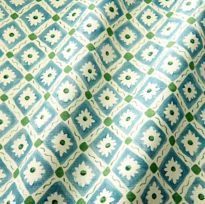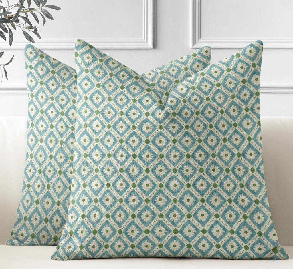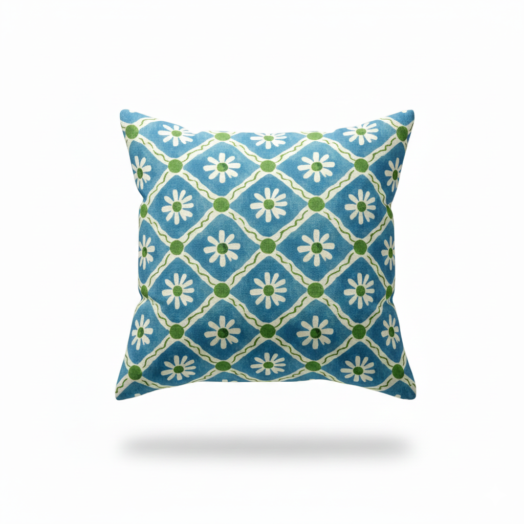 Nuestro Cojín Marin es una pieza de diseño vivaz y divertido, que combina la estructura geométrica con un patrón floral sencillo y encantador. Es ideal para aportar un toque retro y un color brillante a cualquier ambiente. Presenta un patrón de rejilla en forma de diamantes o rombos sobre un fondo de un azul denim o turquesa intenso. Dentro de cada diamante hay una margarita estilizada de pétalos blancos con un centro de color verde brillante. Los rombos están conectados por líneas onduladas de verde lima y puntos verde oscuro, lo que añade un movimiento sutil y una textura visual muy atractiva.