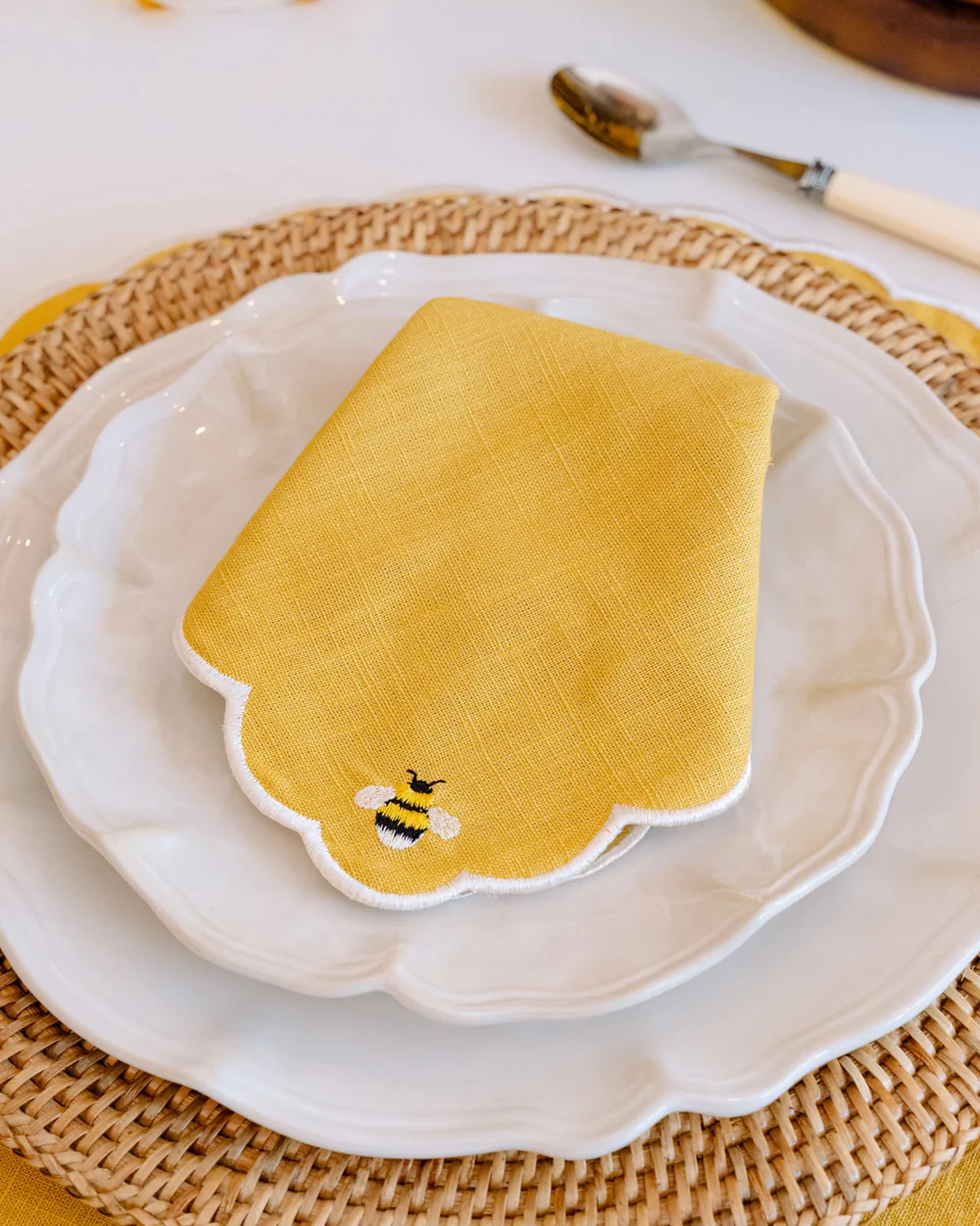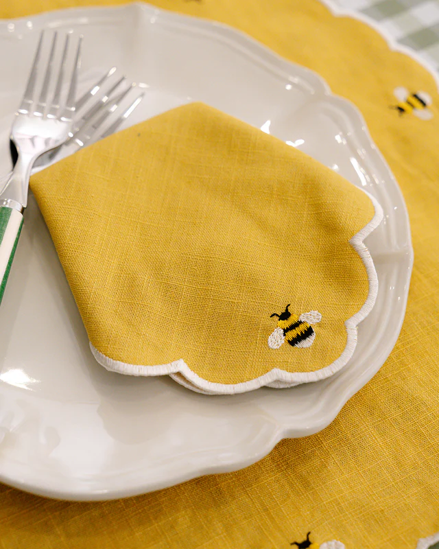La servilleta Abeja es la elección ideal para quien busca un detalle sofisticado y divertido. Con un bordado delicado de abeja y acabado ondulado, esta servilleta aporta encanto y ligereza a sus comidas, combinando perfectamente con el Mantel Individual Abeja.