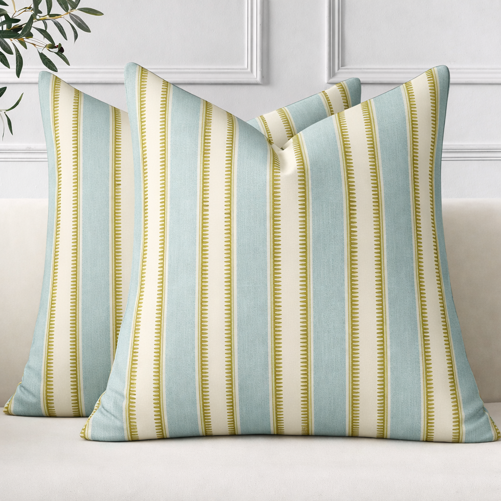 Aporta una estructura elegante y un aire renovado a tu hogar con nuestro cojín Ezra. Esta pieza es un ejercicio de equilibrio y buen gusto, presentando un diseño de rayas verticales anchas en un refrescante verde agua suave que se alternan con franjas crema, decoradas con un delicado borde de espiga o «dientes de sierra» en un tono verde más intenso.